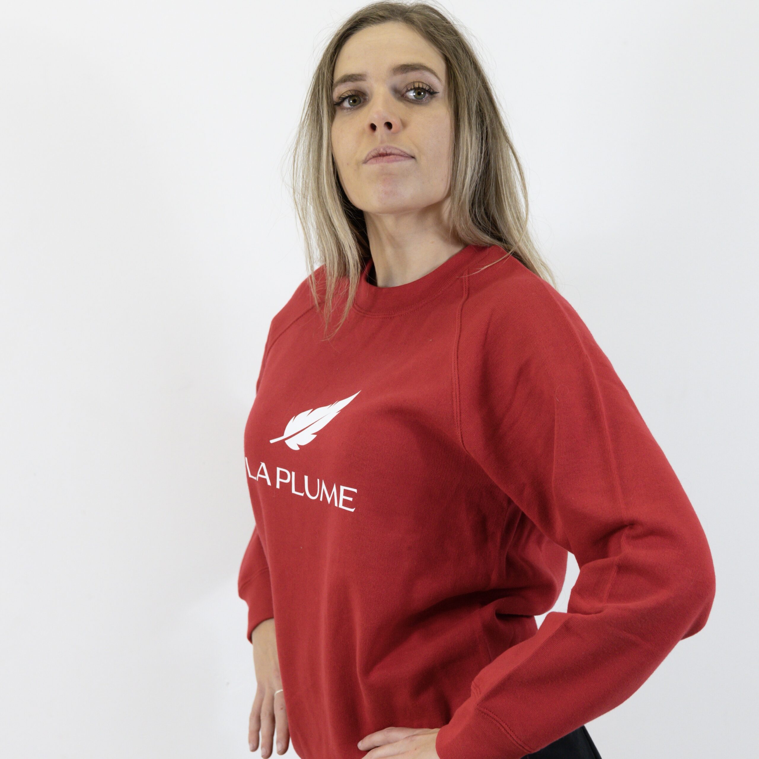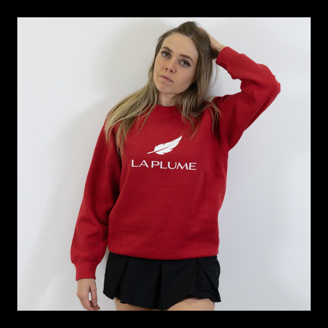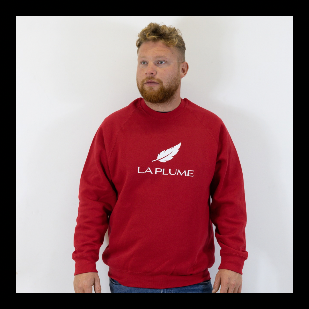 Ce pull rouge unisexe arbore le logo officiel La Plume en blanc, pour un style affirmé et intemporel. Confectionné dans une maille douce et résistante (295 g/m² – 50% coton peigné ringspun, 50% polyester), il offre un confort optimal et une excellente tenue au fil du temps.